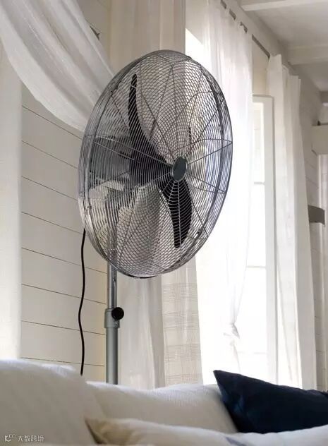 全金属电扇放在窗前的显著位置,侧立在沙发一侧,冰冰凉的金属看上去就显清凉。