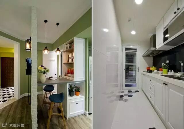 只有 2 个人居住的空间,设计师以吧台代替餐厅,配合开口不同方向的收纳柜,运用上更为灵活,垂吊而下的工业风灯饰提供了温暖却又俐落的照明。紧邻的厨房只是更换地砖及橱柜门片,就令人耳目一新。
