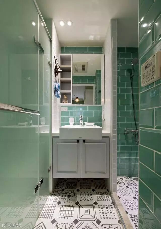 小巧的浴室做了干湿分离,有复古趣味绿色的地铁砖刚好提供清爽的视觉,略带反光的特性更显明亮,配合手绘感的地砖,也成为个性十足的空间之一。