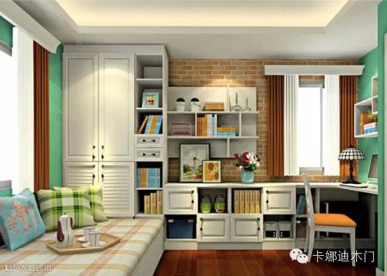 设计师支招:从提升空间利用率来说,通常可以在房间的转角位置打造工作区。在书桌的选择上,可以选用带有抽屉和搁架形式的,增加储物性。
