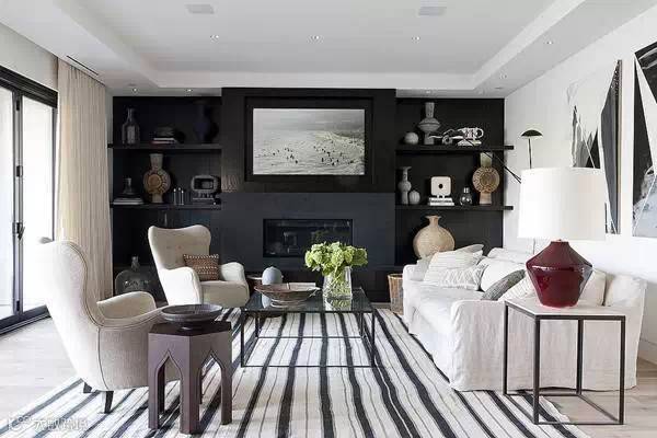对于客厅里的电视墙,采用暗色可以在视觉上更突出屏幕,扩大客厅空间,和周边的白色相搭配也很简约美观。