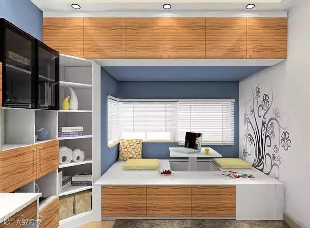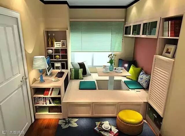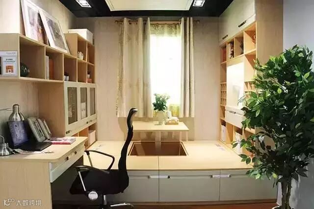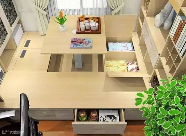 在书桌柜的基础上加一个可收纳的榻榻米。集办公、睡眠、会客和储物功能于一体。