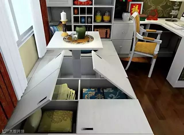 升降台升起来可以当桌椅招待客人,降下来可以当床用。