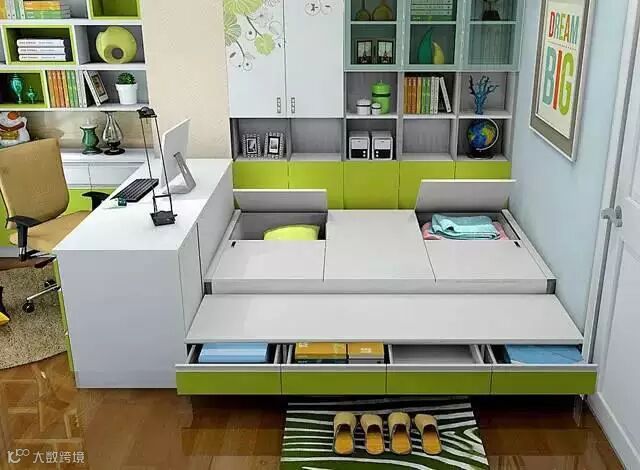放床和书桌柜,但是这样需要多辟出一个放衣柜的地方,这对小户型来说不合实际。