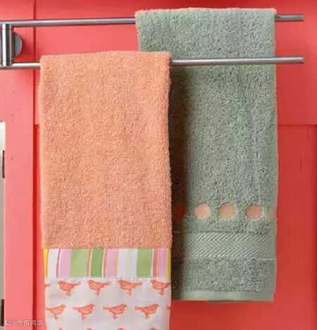 改造方法:右边灰色的擦手毛巾平淡无奇,但在其下摆处绣上藕荷色的圆点,一下子就俏皮多了吧。同样,左边这条藕荷色毛巾的底边接上一块有同色系图案的花布,然后用丝带盖住接缝处,平庸的擦手巾马上变身浴室装饰物。