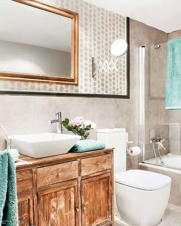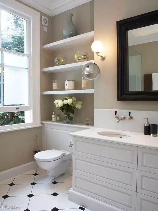 面盆下面的空间利用起来,装个小柜子,装装电吹风剃须刀,收纳平日里不常用的东西。面盆一侧的墙面也可以装上壁橱增加收纳空间,让打折时购买来的战果有容身之处。