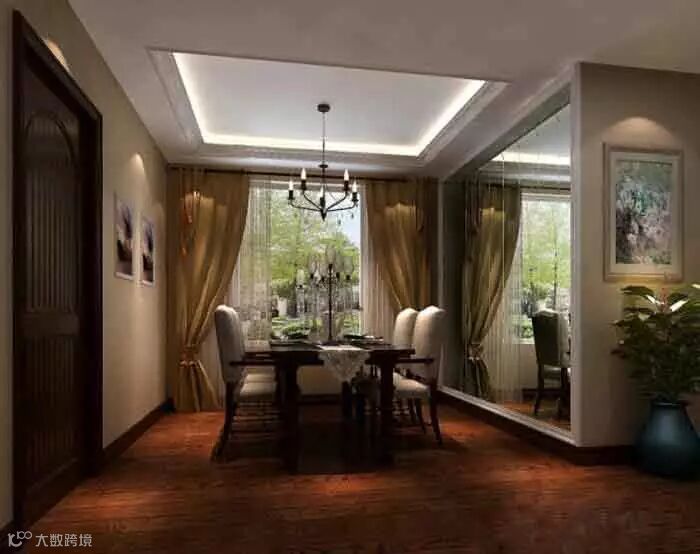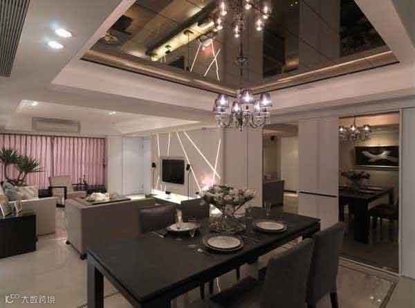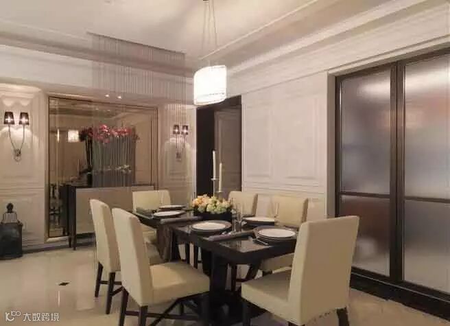 简约风格隐形拉门图片,延伸至餐厅的是一整排隐藏式拉门,门拉开则可收纳日常用品及提供放置小型的电器用品,透过实用居家调查将室内空间做完整有效的收纳。色调沉稳的餐桌椅及特别选用带有现代美式风格的水晶灯饰,华丽大气。