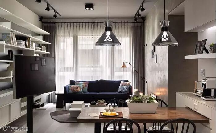 开放式客、餐、厨,让空间有效放大,颠覆传统,不设计电视墙,而以旋转电视架取代,让空间利用更灵活而有弹性。