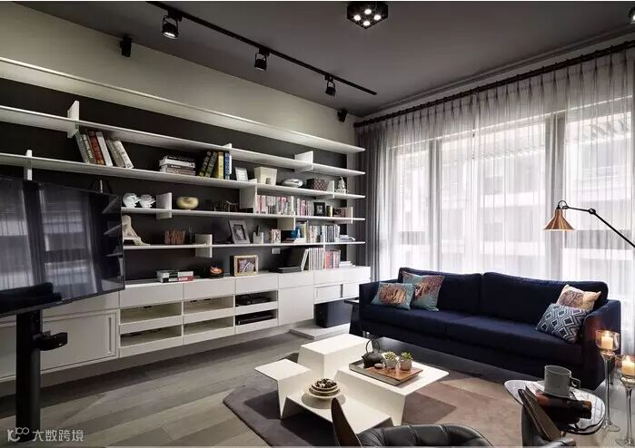 由于年轻夫妻的工作关系,两人都拥有大量藏书,因此在客厅规划了一整墙的开放式层架结合收纳柜及机柜,满足实用需求。 透过利落的现代设计,打造简约的空间舞台,接下来则需透过家具、家饰等软装布置,丰富生活。