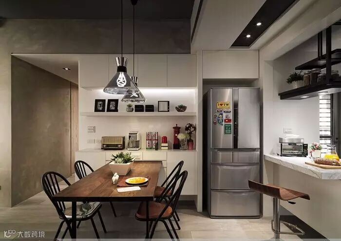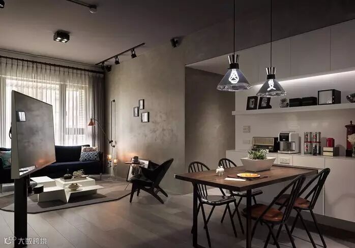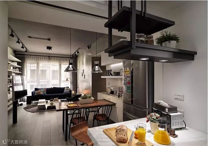 为了放大空间坪数,让夫妻俩互动频繁,公共空间采开放式设计,利用厨房吧台,及餐桌、沙发等家具,界定不同使用区域,并颠覆电视墙设计,在餐厅、客厅交界处,设置可旋转的电视架,让空间利用灵活而有弹性。