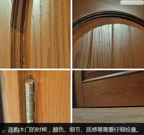 看外观:选购木门的时候有几个地方是需要仔细检查的,包括颜色、细节、质感等。质量较好的木门选用的油漆比较好,门板的颜色看起来也比较均匀、自然;门板的材料较好,则手感细腻、光滑,整体感觉均匀、美观;做工合格的门,门扇和门套外形对称、无变形、嵌合正确。