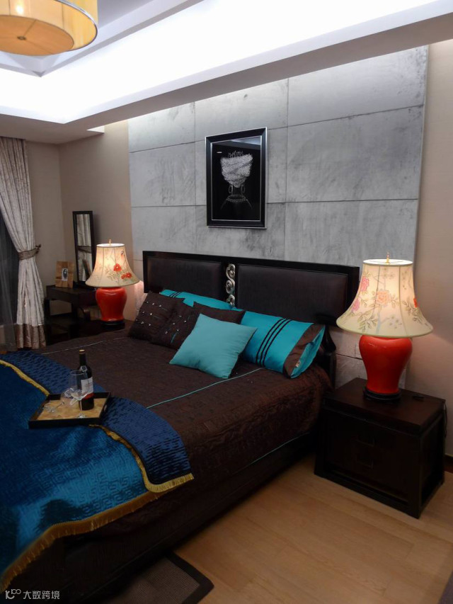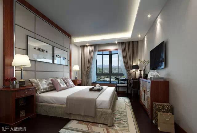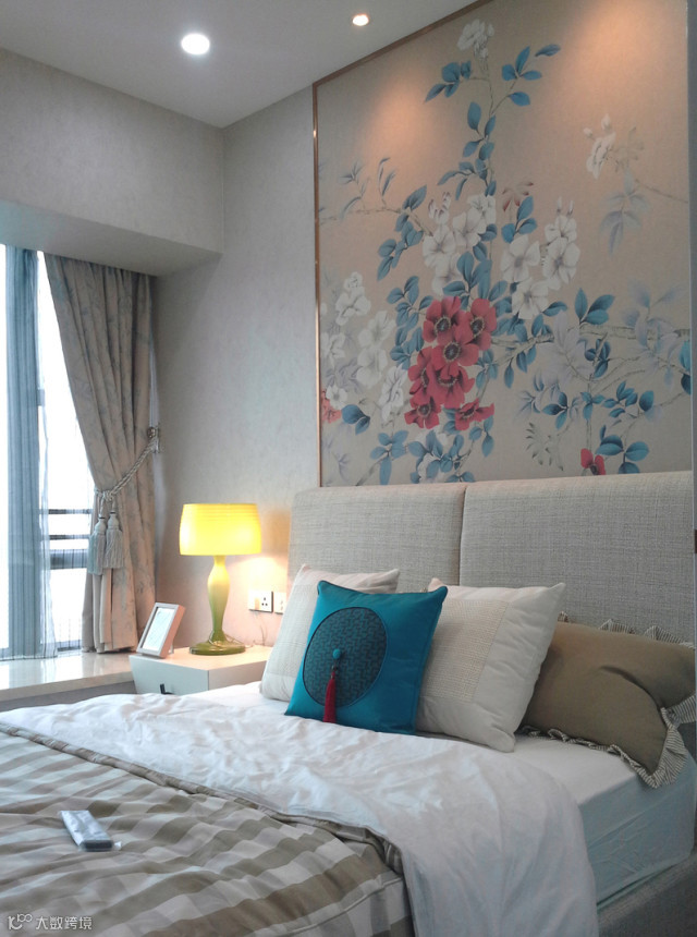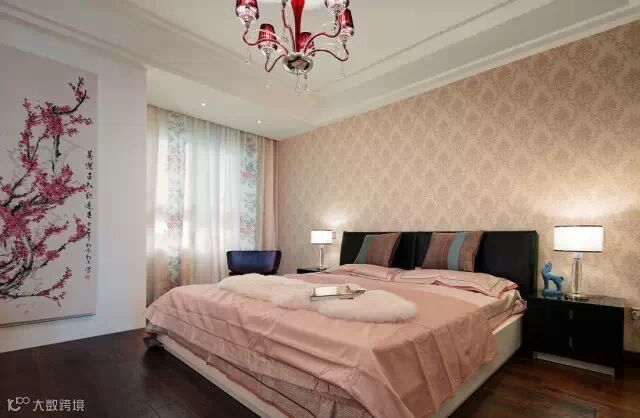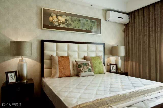 大床没有靠墙设置,而是空出一定的位置在床头两边摆放床头柜,对称摆放让空间布局更平衡,而且两边上落床也比较方便。