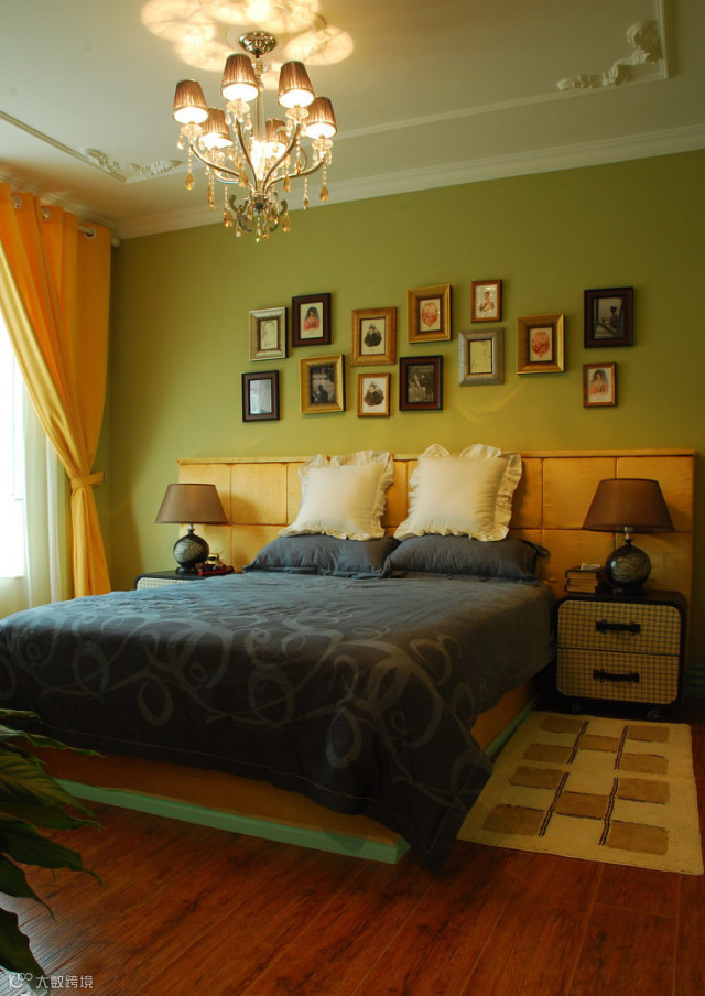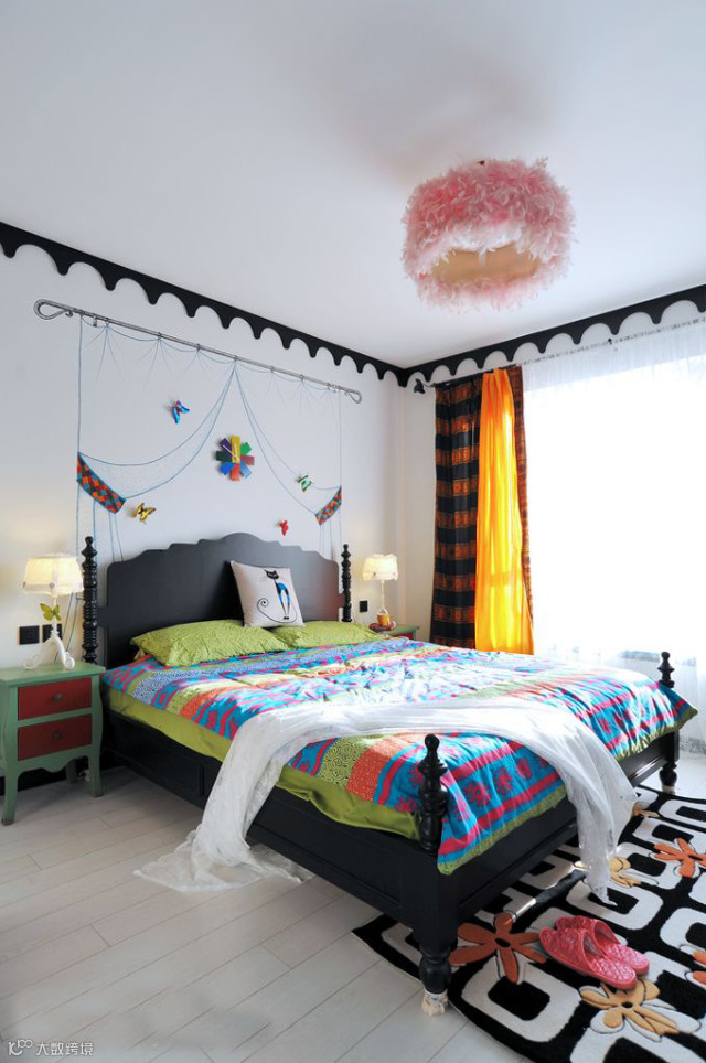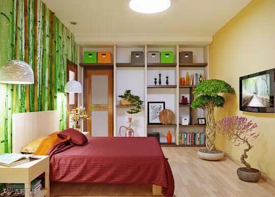 绿色竹子图案的床头背景墙,大红色被褥,米黄色壁纸,木质地板,绿色盆栽,各种颜色碰撞一起,形成强烈的视觉冲击力,展现青春活力空间。