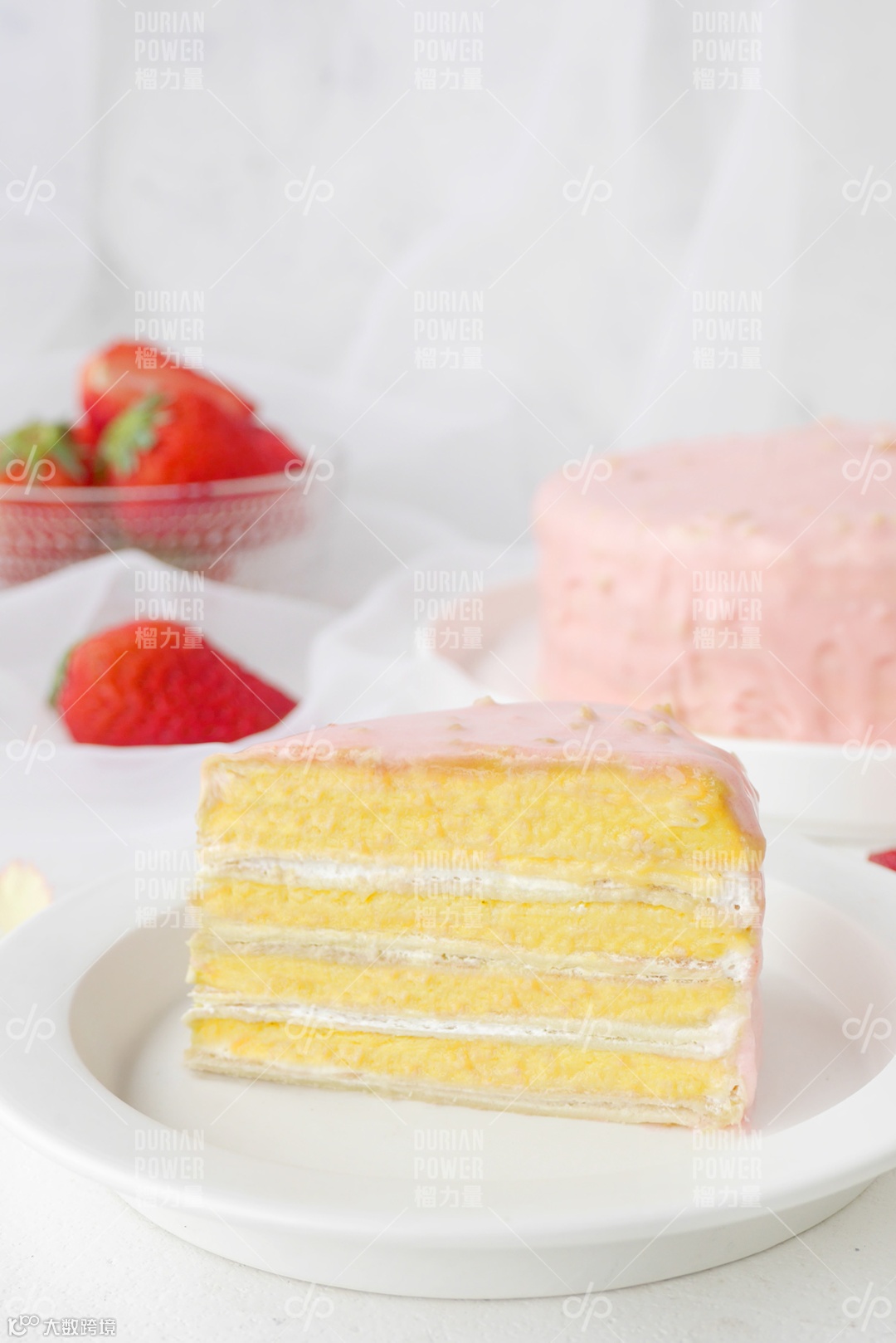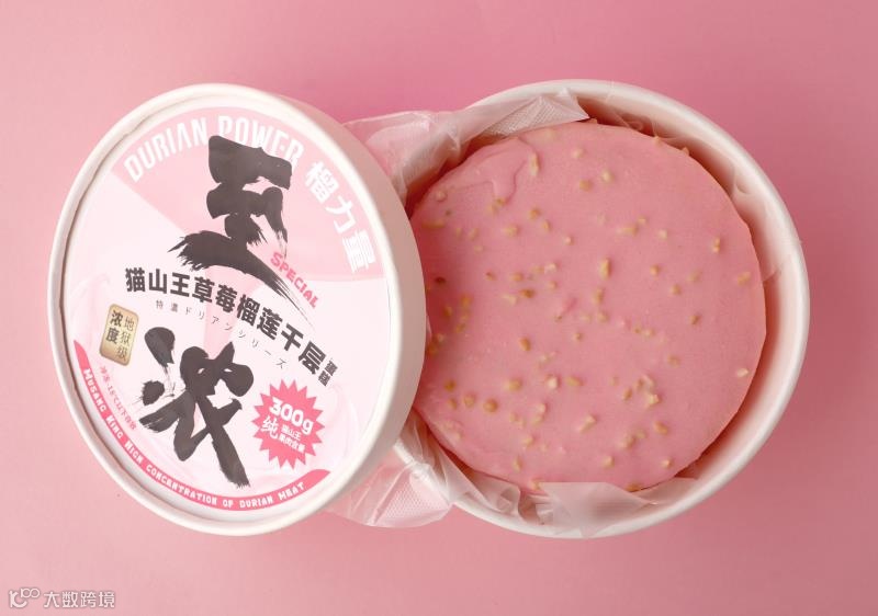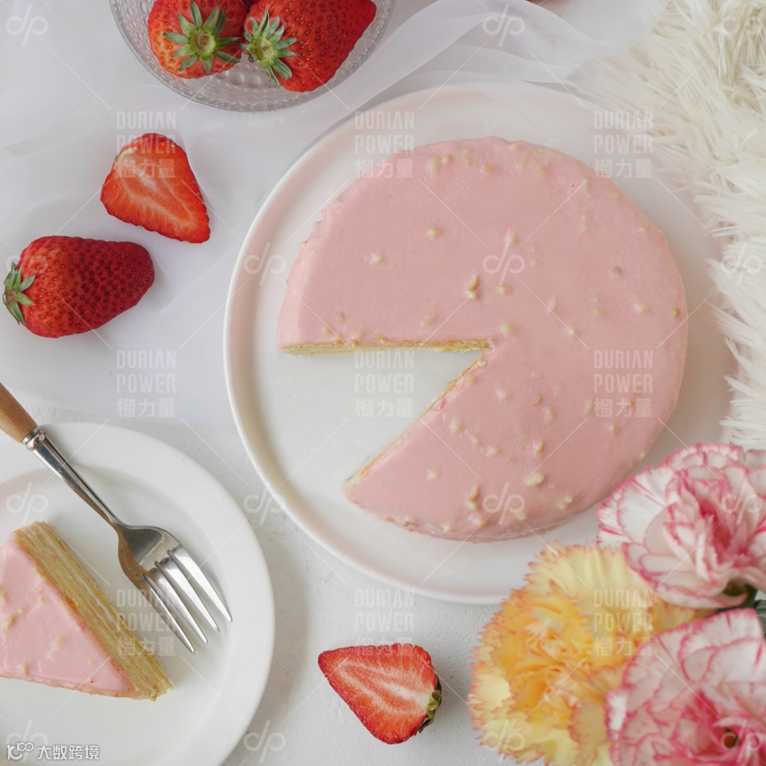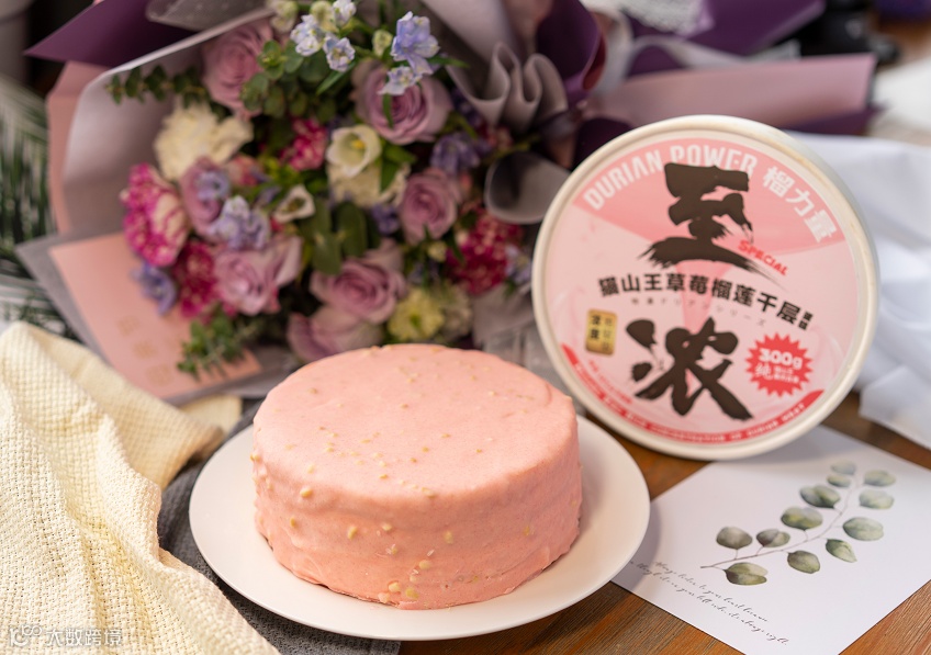甜蜜少女心的,榴力量延续猫山王千层300g一口一个榴莲的梦幻口感标准,原本浓郁的黑巧克力浇头,换成了粉玫瑰的粉,回忆的粉,粉色果仁巧克力