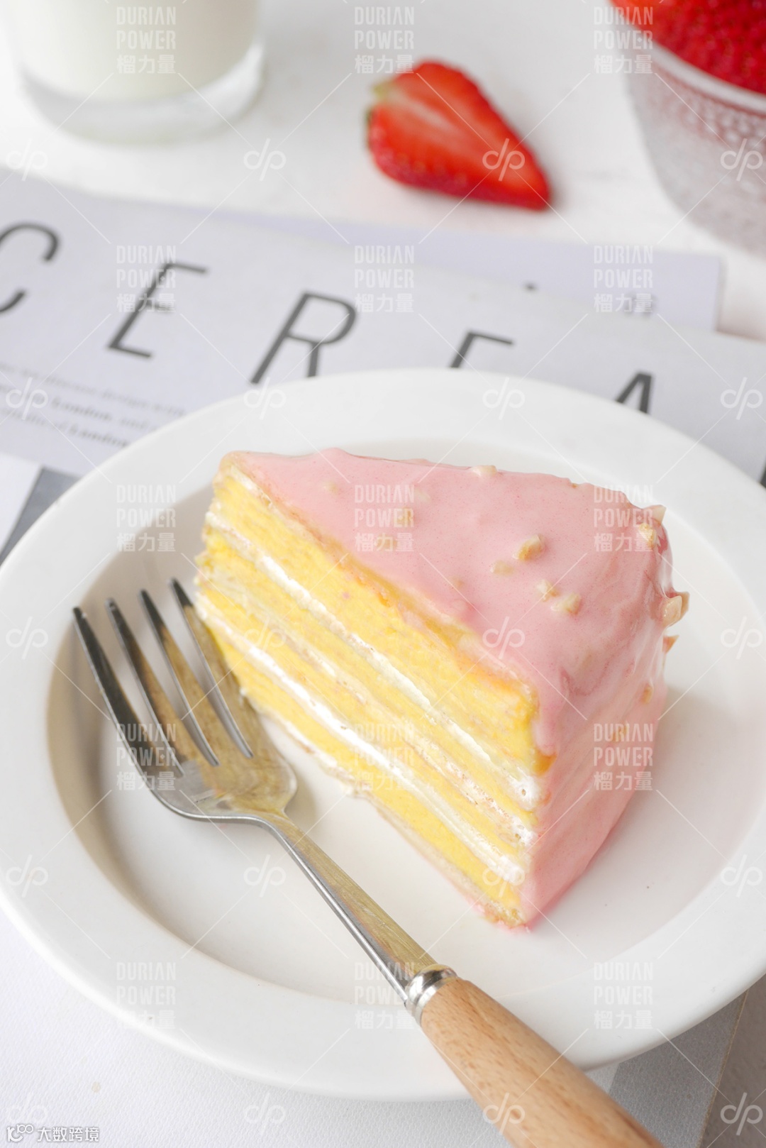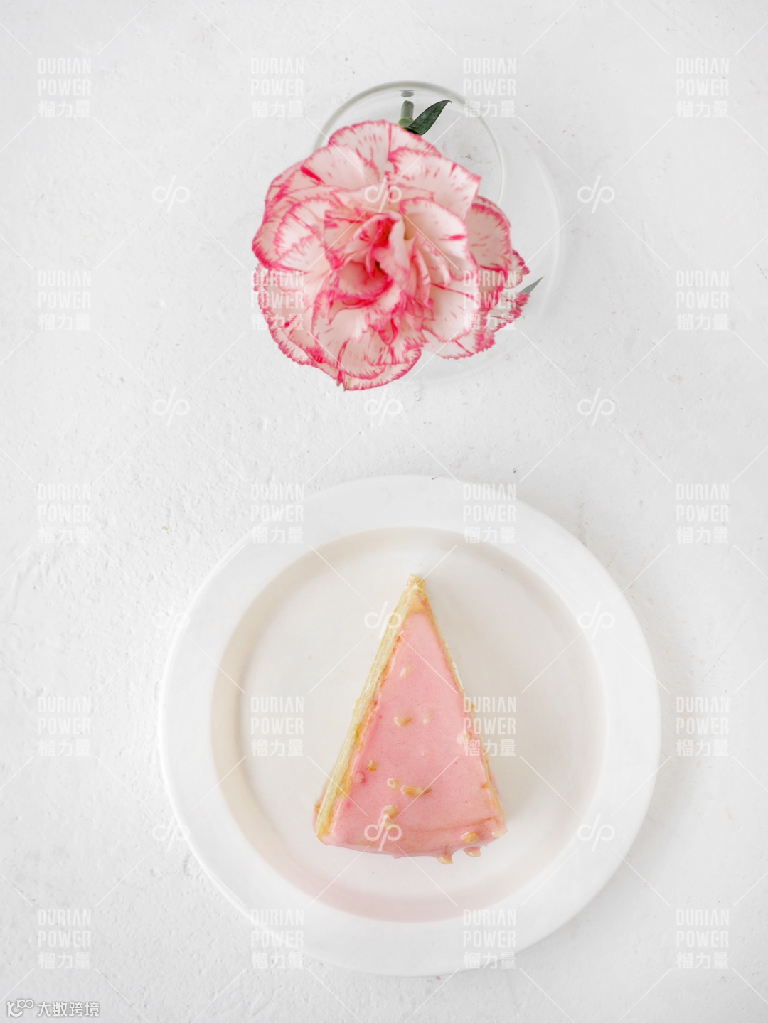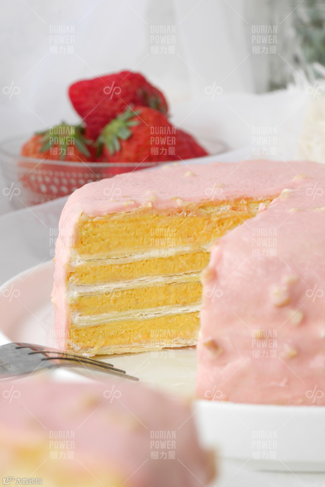 甜蜜少女心的,榴力量延续猫山王千层300g一口一个榴莲的梦幻口感标准,原本浓郁的黑巧克力浇头,换成了粉玫瑰的粉,回忆的粉,粉色果仁巧克力