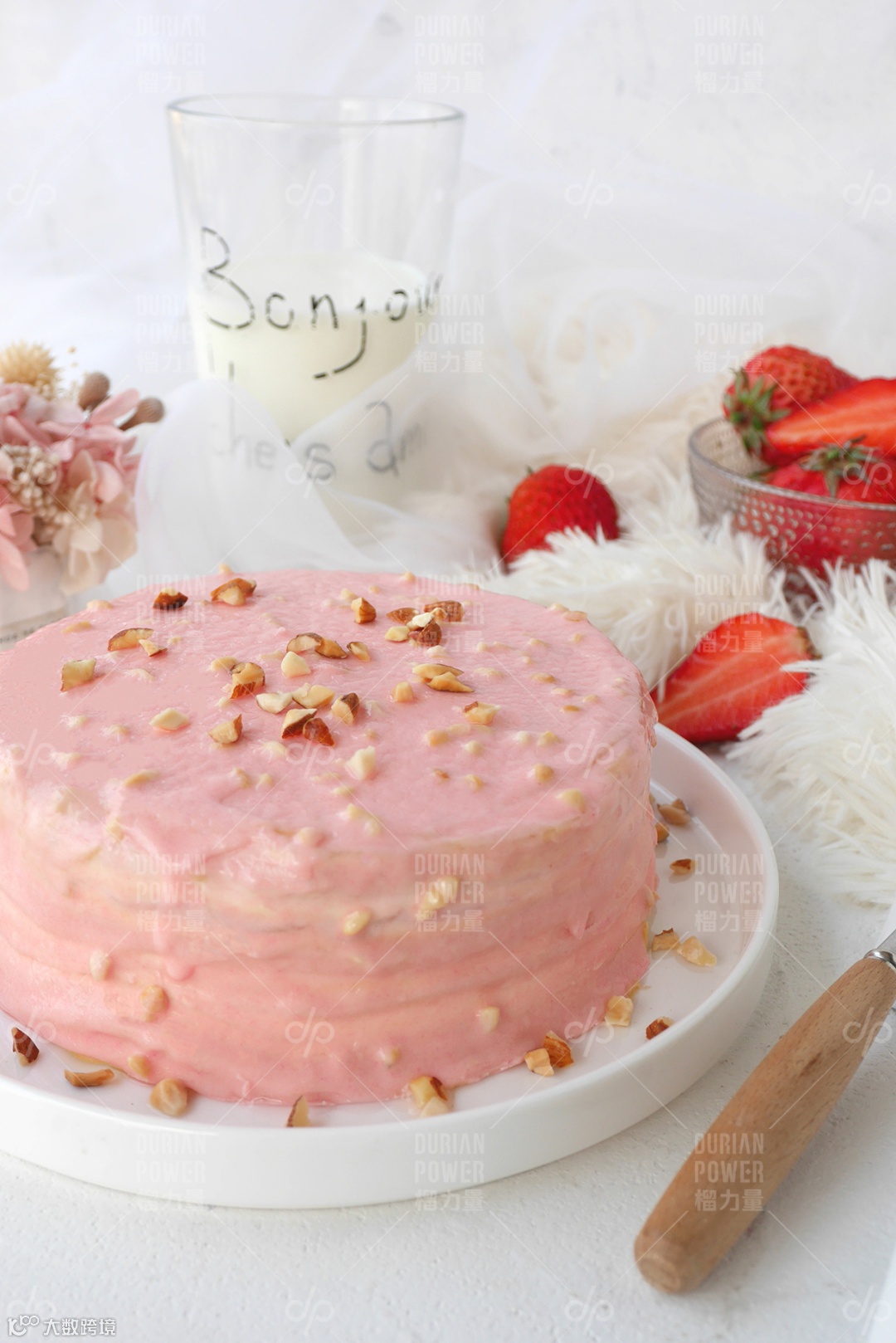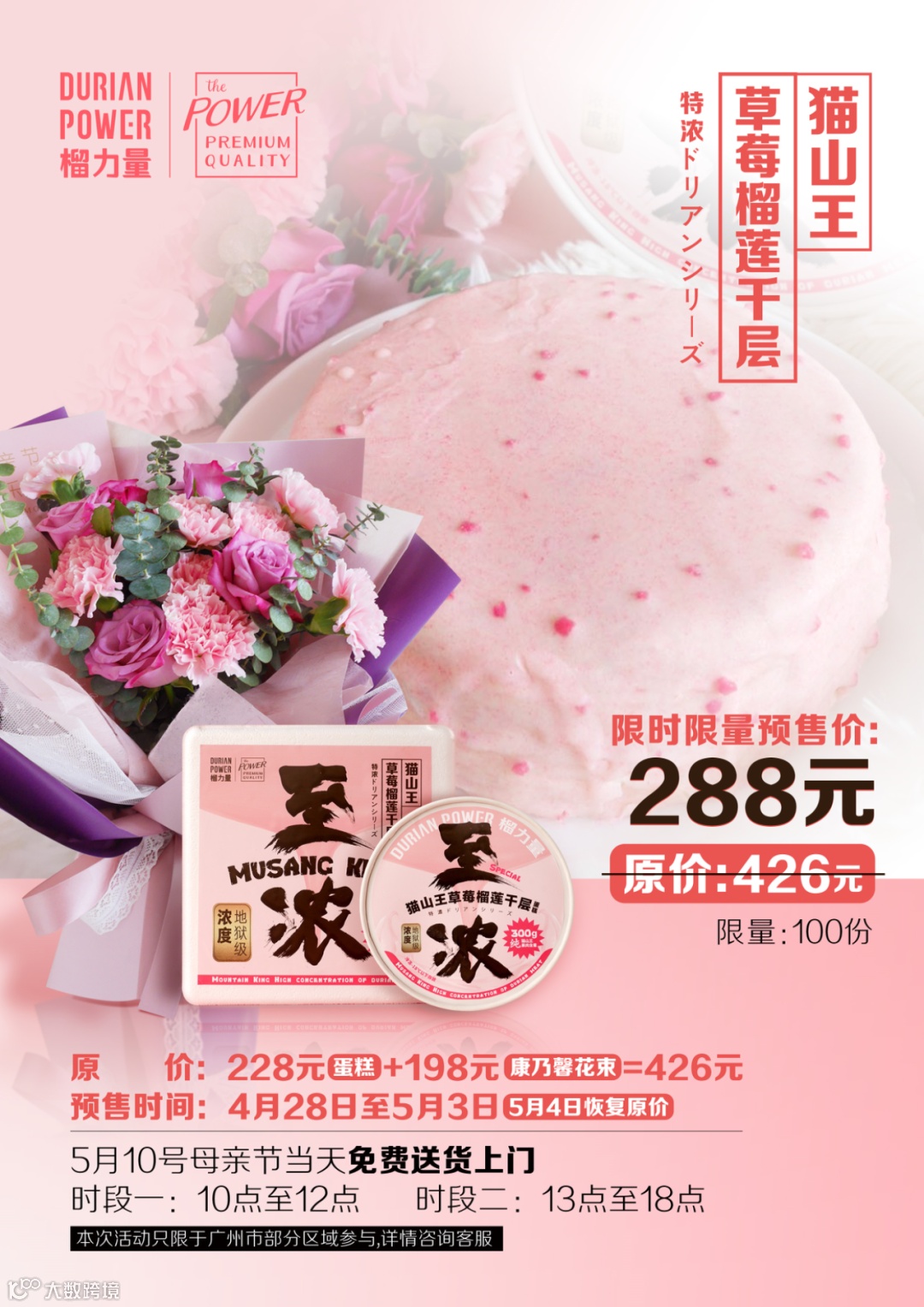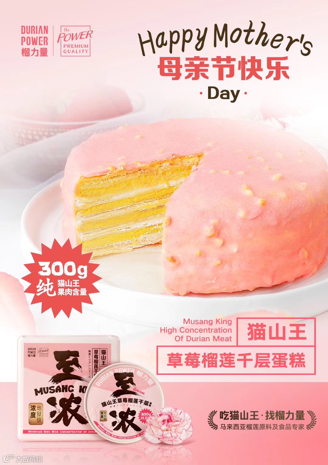 猫山王草莓榴莲千层+康乃馨花束
