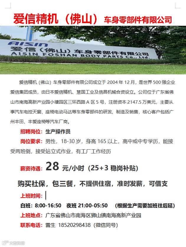 可安排面试 | 爱信精机(佛山)车身零部件有限公司 | 高单价28元/小时,购买社保,包三餐 |