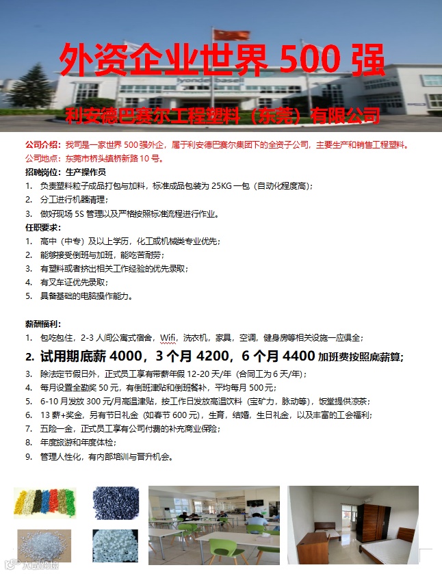 可安排面试 | 外资企业世界500强【东莞巴塞尔】高底薪+年终双薪+各项补贴