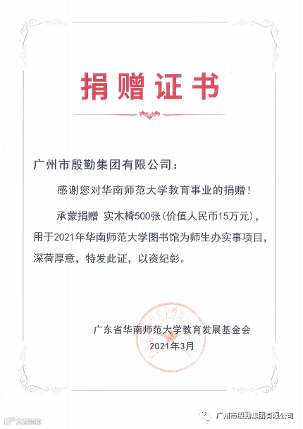 3月29日上午,在华南师范大学图书馆万日融书记、赵淦森馆长、华南师范大学校友联谊会兼教育发展基金会吴小绒副秘书长等领导的共同见证下,殷勤集团总裁余观帝先生和陈晓澜女士代表集团捐出价值15万元共500张实木椅等一批物资,用于支持2021年华南师范大学图书馆“为师生办实事”项目。捐赠仪式上,余总裁也接受了学院领导所颁发的捐赠证书。