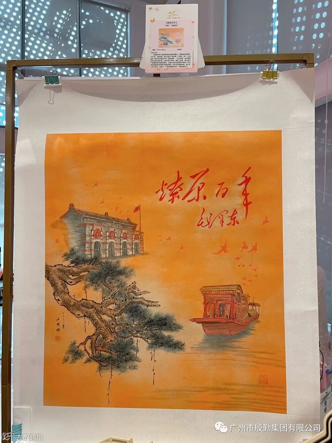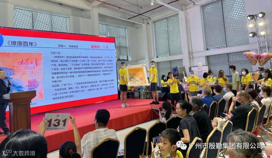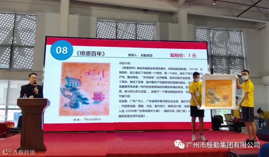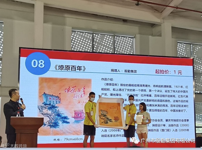 殷勤集团为此次活动精心准备了拍品,集团领导伍剑雄捐赠创作的中国画《燎原百年》,作品描绘了一艘红船从南湖扬帆启航,曙光降临,伟大的中国共产党诞生,百年征程开启新格局。这幅作品引起现场众多买家的兴趣,经过一轮激烈的竞价,最终以1200元成交。恤孤助学会向集团颁发捐赠证书。此次义拍活动的藏品共26件,成交26件,筹集善款约12万元。