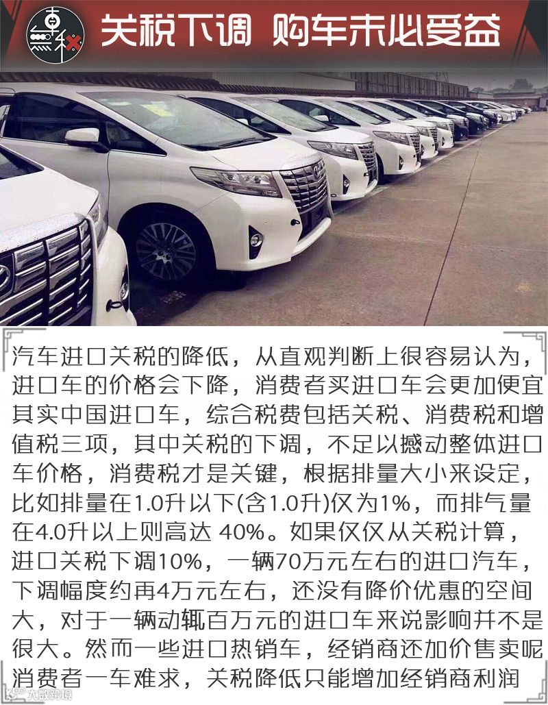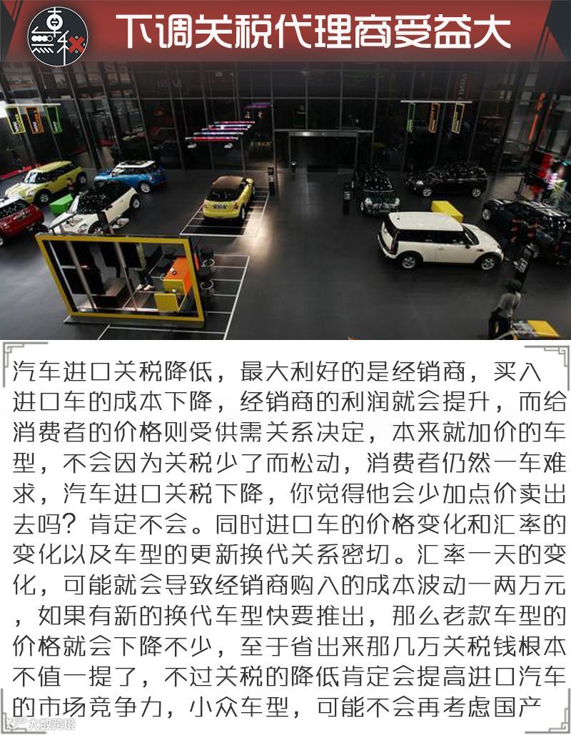 在中国汽车市场,进口车在总量中占比只有4%左右,加上合资车、自主品牌车质量不断提升,性价比不断提高,抗挤压能力很强,因此从整体上看,影响也不会太大,消费者真正能受益的地方并不多,尤其是超百万级的豪华进口车,影响几乎微乎其微。