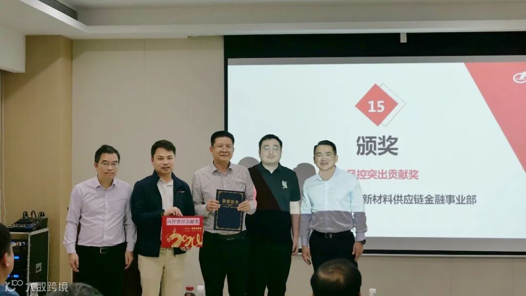 财务风控副总裁冯志学给科技新材料供应链金融事业部颁发“风控突出贡献奖”,对其风控工作的重要贡献