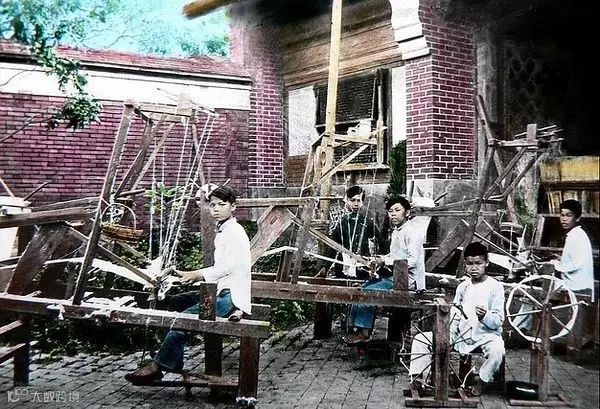 ▲男孩子在学习如何用纺车织布