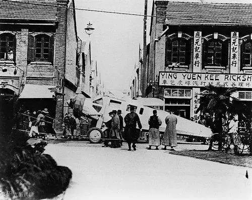 ▲中国购买的飞机用绳子拉到汉口机场,途经一个小镇时,与人力车行构成了显明的对照。