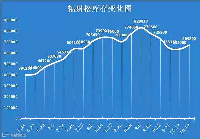 华东地区辐射松原木库存变化图