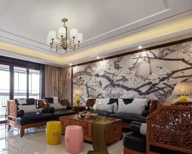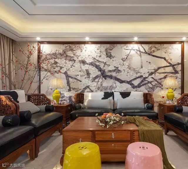 客厅沙发墙以大幅梅花壁画做背景,辅以实木边框点缀,端庄禅意;这套实木雕花沙发,搭配黑白皮质坐垫,稳重大气;一角的红梅观景更添一分意境;黄色和粉色鼓凳的加入,则让整个空间变得更加活泼靓丽。