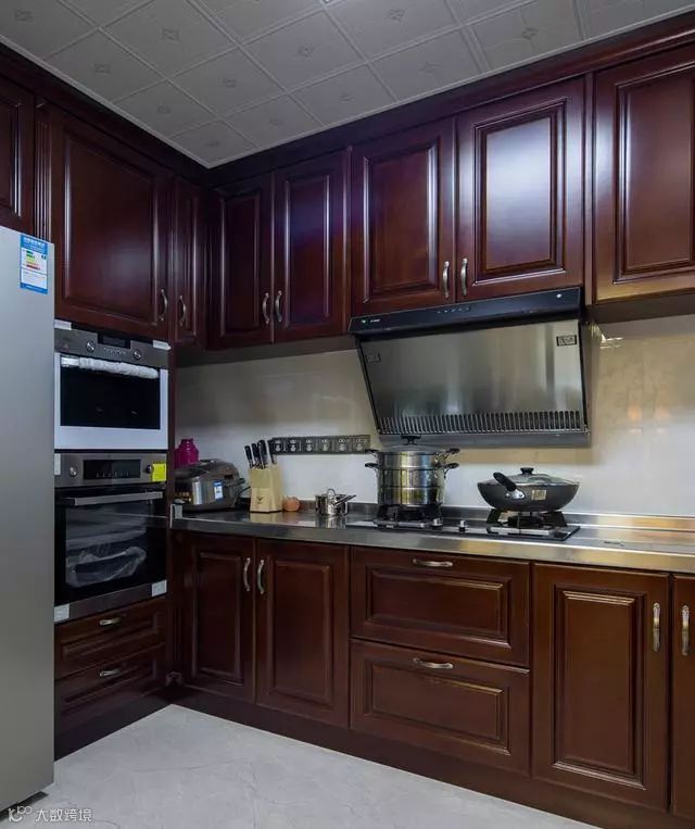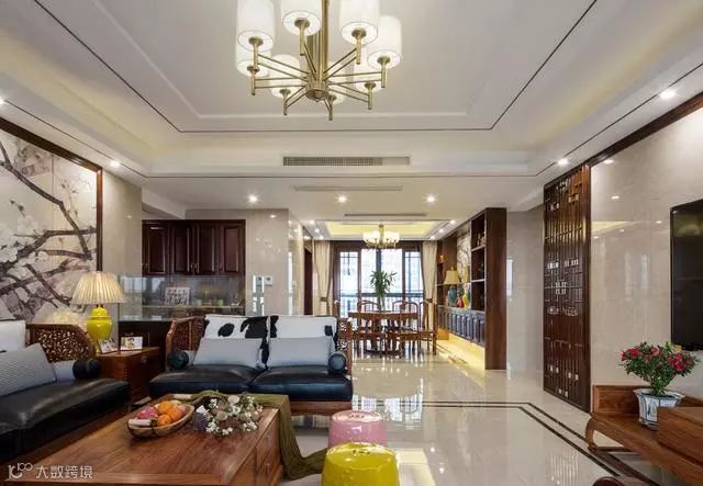 室内装了中央空调,顶面还走了一圈中式线条做点缀,搭配金属质感的吊灯,简约又大气;南北通透的户型,让整个空间格外的通透敞亮,辅以中式布局,尽显端庄华贵。