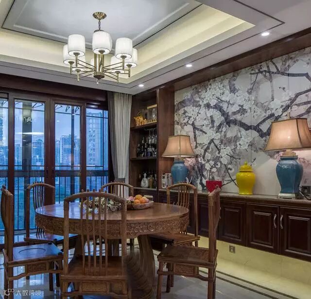 餐厅背景墙选择了客厅同款,保持整体风格的高度统一;悬空餐边柜搭配陶瓷制品,端庄又稳重;这套中式雕花桌椅,尽显古韵古调。