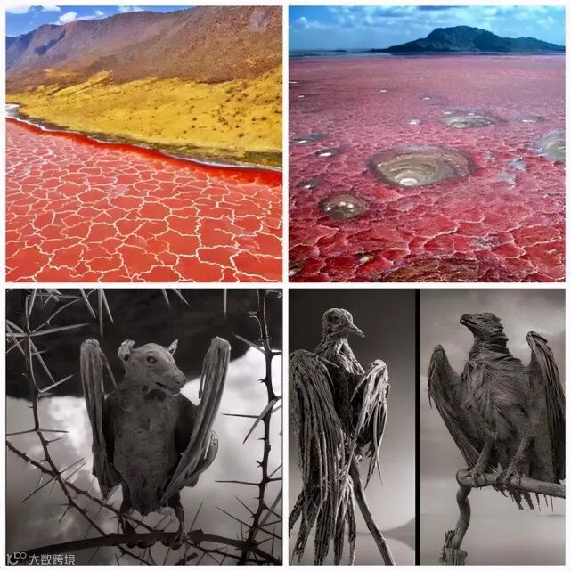 非洲纳特恩湖中的碱性水的pH值高达10.5,具有很强的腐蚀性,会刺激或灼伤动物的皮肤。导致死亡的动物最终钙化,好像突然被石化了一样。