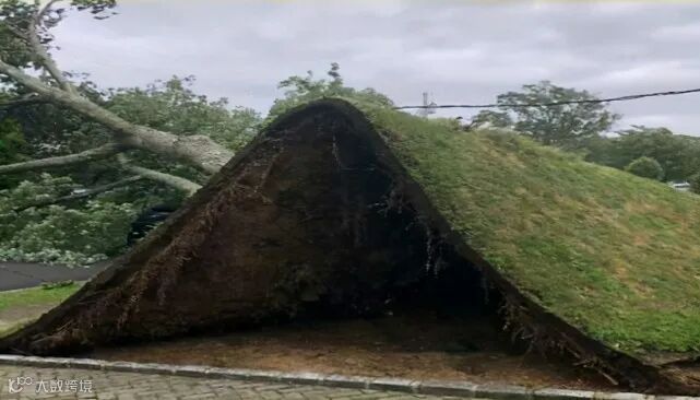 可以看出树根延伸的面积,大树倒了还掀起了整块的草坪。