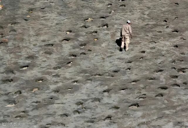 一名男子沿着玻利维亚苏克雷附近的8000万年前的恐龙足迹行走