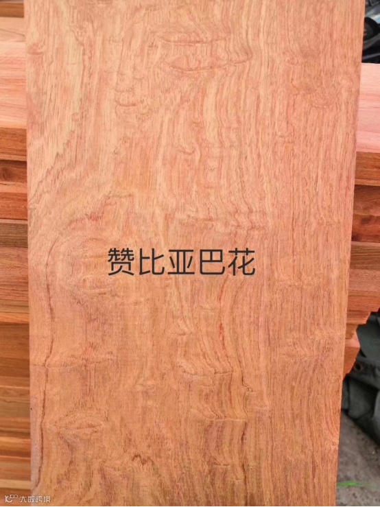 赞比亚巴花,学名鞘籽古夷苏木,纹理交错明显,带有浅棕色条纹。主要分布于热带非洲赞比亚,木材具光泽;有轻淡的木香味,结构细而均匀,质量硬,强度高,是一种名贵硬木,可与缅花相媲美。可以用于别墅,套房,写字楼,商场,酒店等的高端装饰,也可以制作豪华家具、地板、生活器具等。气干密度约为0.8-0.96g/cm3,湿材甚至有达到1.2g/cm3,简卡硬度2090,木材重,强度高,不受白蚁危害。边材心材区分明显。边材为淡黄白色,心材淡红色或棕褐色,伴有深红褐色细斑纹。略细而均匀,纹路通直局部交错,新切木料具有自然的木香味,赞比亚花梨属于约15种巴花中的一种,属于高级品种,是古夷苏木里材质最为稳定的品种之一。