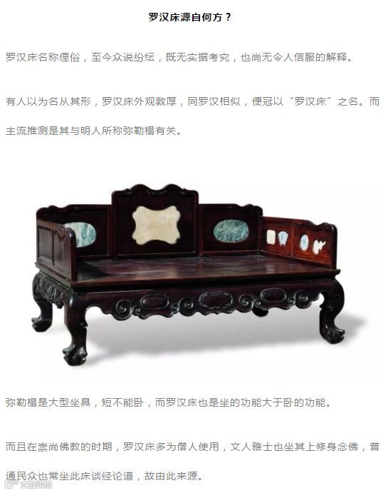 另有人说 “罗汉床”是明清宫廷“宝座”的前身,小的称为榻,如现代的“沙发”。