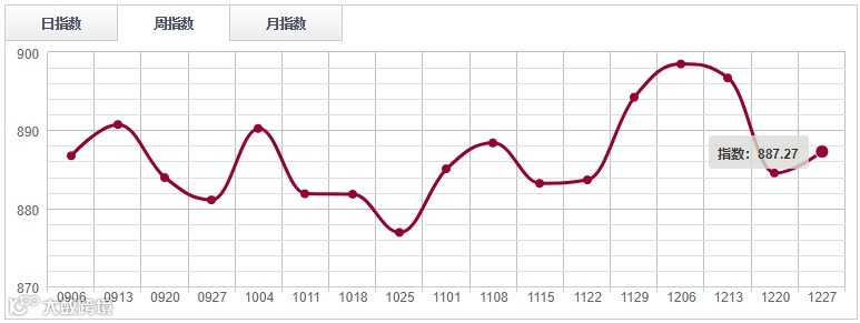 人造板分类指数在经过两周的回落之后,本周重回升势,报收887.27点,环比上涨0.31%。其中鱼珠人造板指数、福人人造板指数、大西南人造板指数分别下跌0.01%、0.05%、0.95%;临沂人造板指数上涨0.89%。