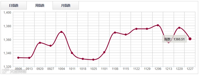 临近年底,红木市场当下蓄势态势明显,市场正处于震荡盘整的格局。根据中国木材价格指数网监测数据显示,本周国内红木分类指数周指数报1360.51点,周环比下跌16.34点,跌幅1.19%。不过在成交方面,本周销量环比上涨2.83%,交易额增加1.7%。由此也不难看出,当前红木市场虽然上行有压力,但下行空间也十分有限。