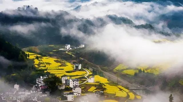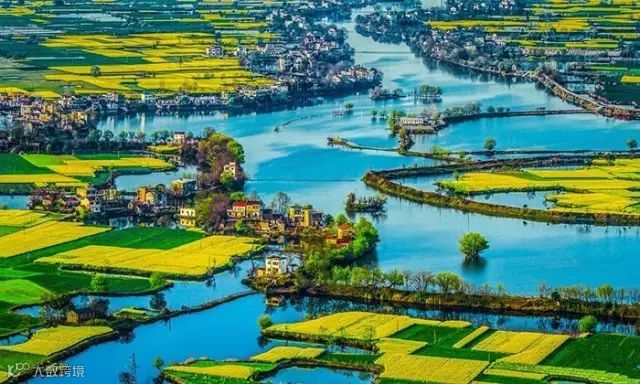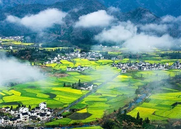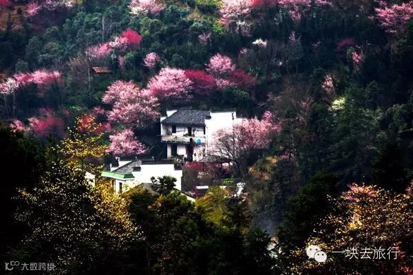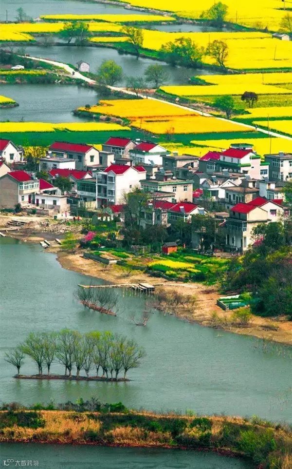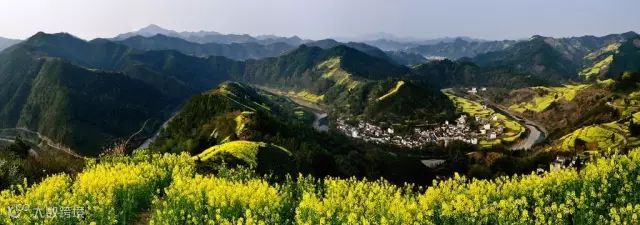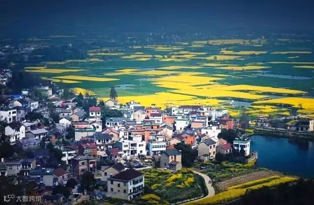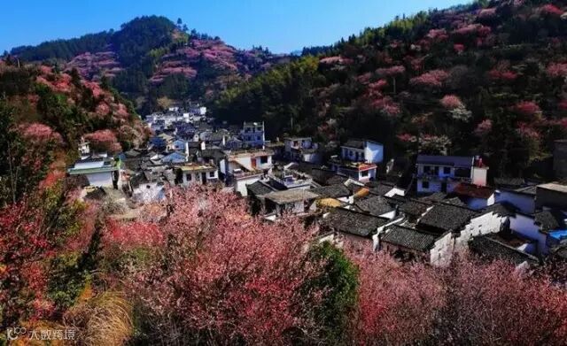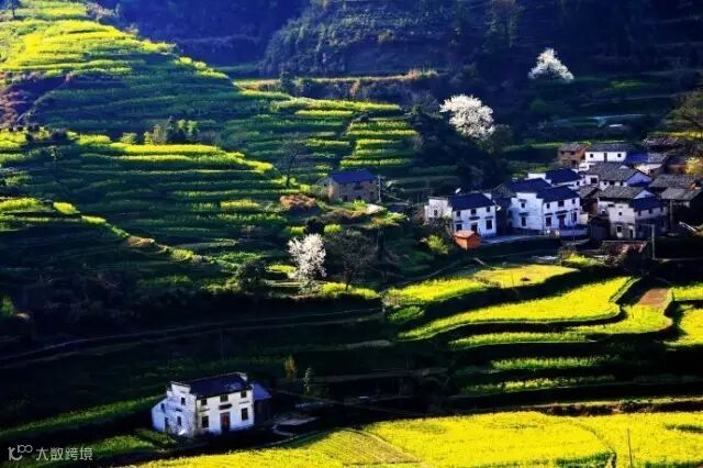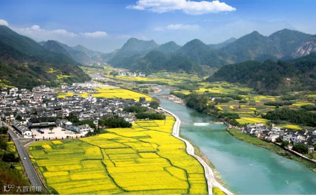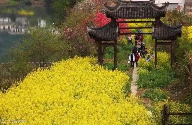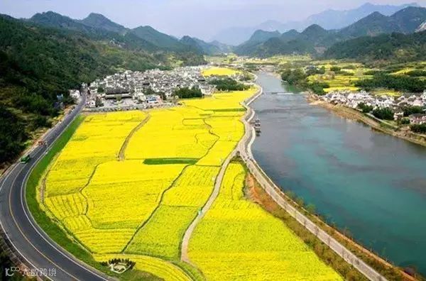 块垒状油菜花田铺满山坡,包围了皖南古老村落,如火如荼绽放的桃花和梨花散落其中,远处碧绿昌源河悠悠流淌,形成了一幅幅3D春色画卷!
