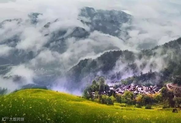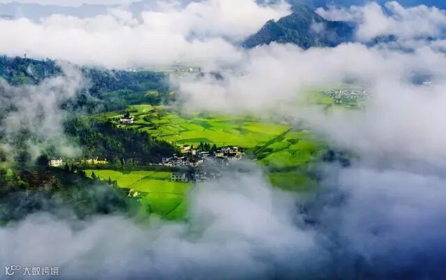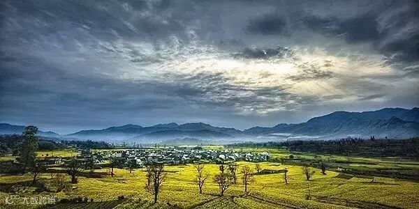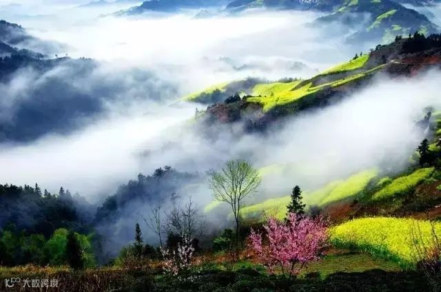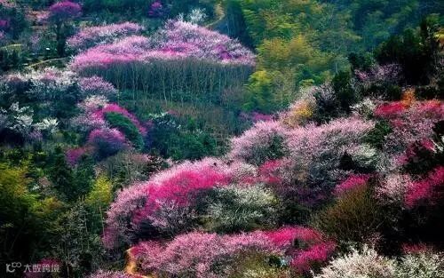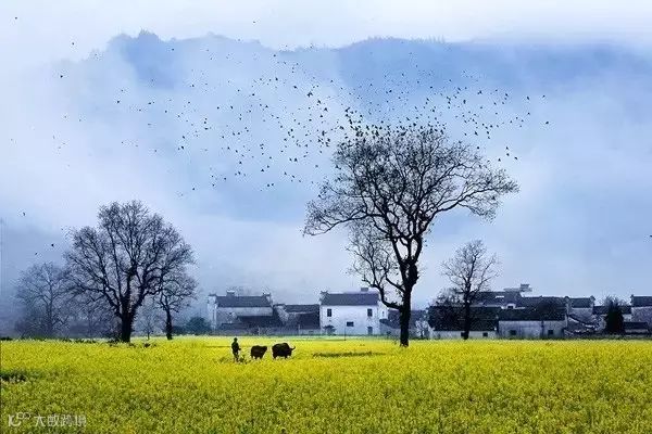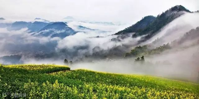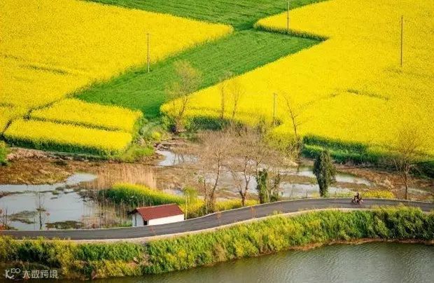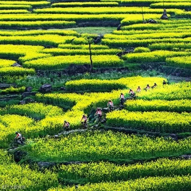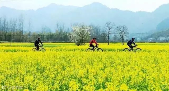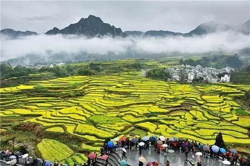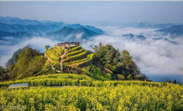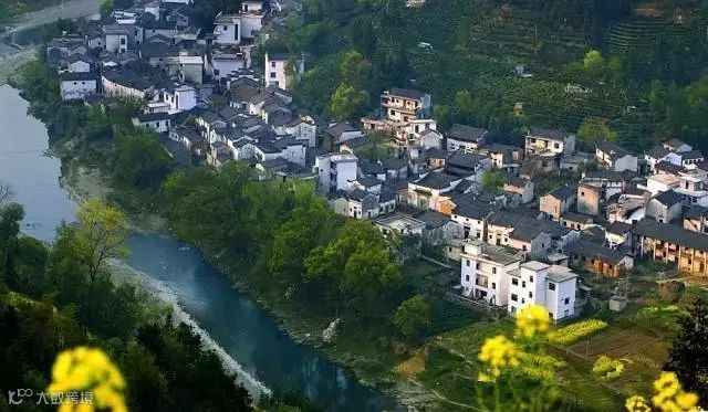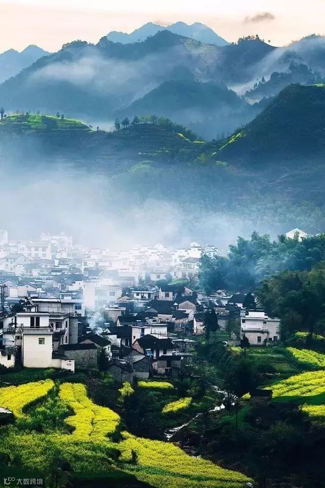 块垒状油菜花田铺满山坡,包围了皖南古老村落,如火如荼绽放的桃花和梨花散落其中,远处碧绿昌源河悠悠流淌,形成了一幅幅3D春色画卷!