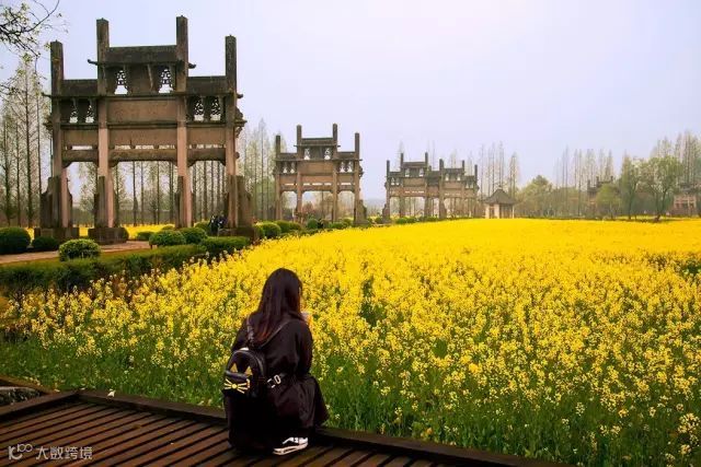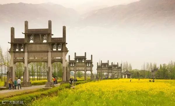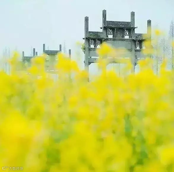 春风和煦,巍峨的七座牌坊在金黄色的花海中矗立,古朴典雅,蔚为壮观,一片诗情画意的风光美景。