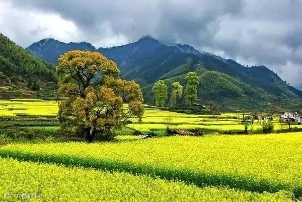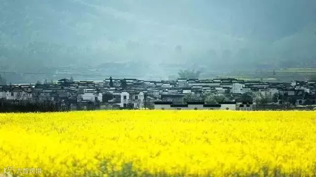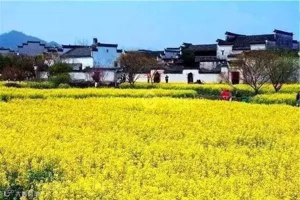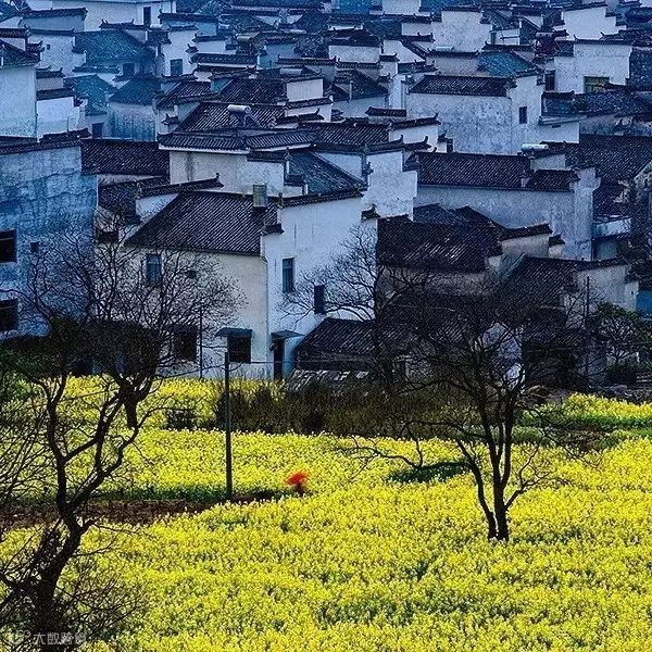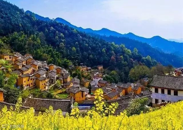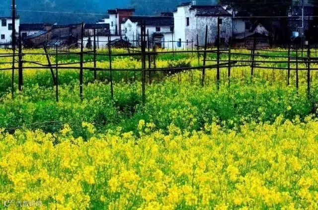 在黄山脚下,有一幢幢高低错落有致的徽派民居,在金黄色的油菜花掩映下层次分明,清新夺目,乡村韵味十足的田园风光与徽派古雅民居交相辉映!