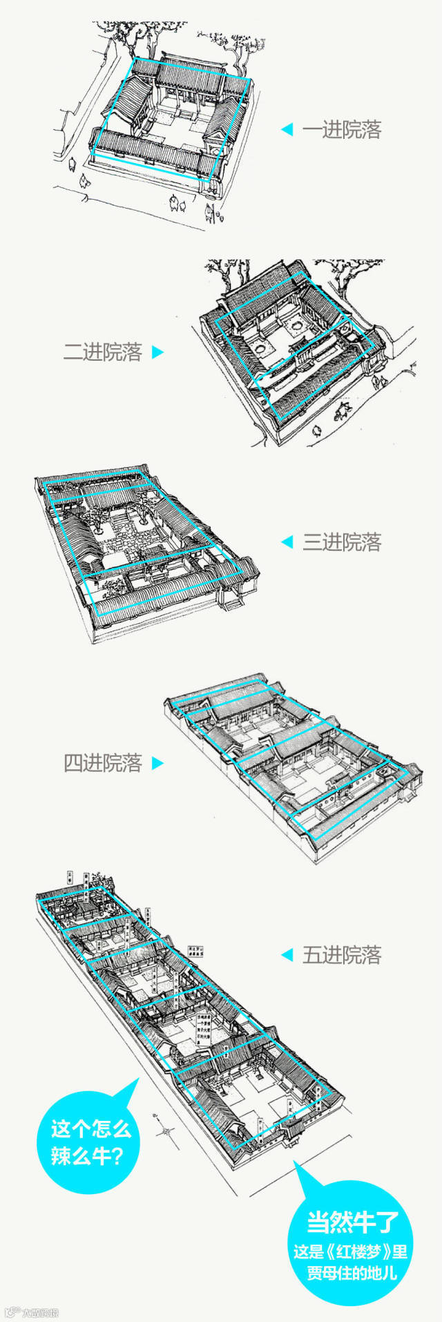 一般来说,整个建筑呈“口”字形的称为一进院落;“日”字形的称为二进院落;“目”字形的则称为三进院落。庭院越深,越不得窥其堂奥。