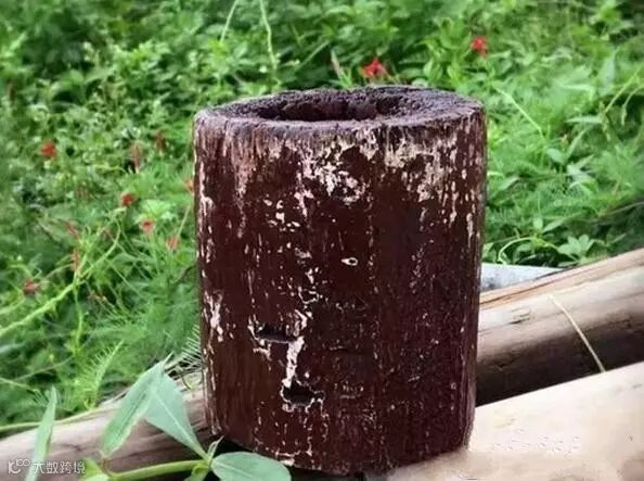 小叶紫檀是红木当中最为坚硬的,一般来说不会被虫蛀,这块紫檀料上的坑洞是人为所致,就这根木料的粗细,想必当年是用来做门柱用的。