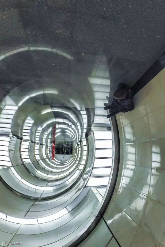地板反射走廊的天花板,再加上躺着的人,营造出一种如临深渊的错觉!
