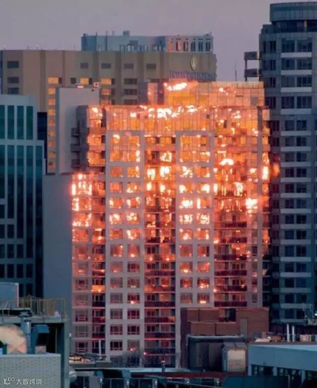 大楼的玻璃窗户反射着夕阳的光辉,仿佛发生了火灾一般!