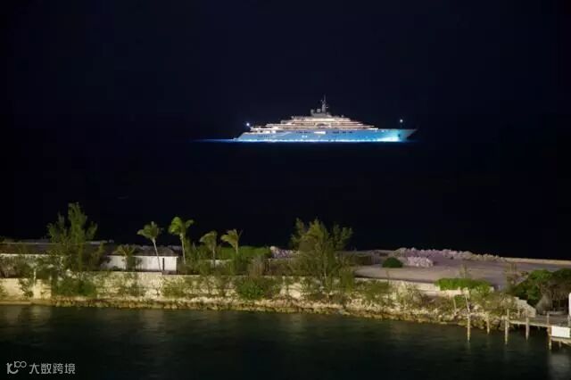 晚上黑暗的海面,让远处的邮轮,看起来像是航行在天空中。