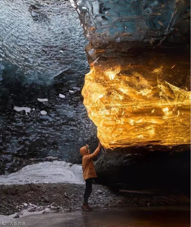 这个冰川洞穴,在傍晚夕阳的照射下,把冰川变成了金色的“琥珀”