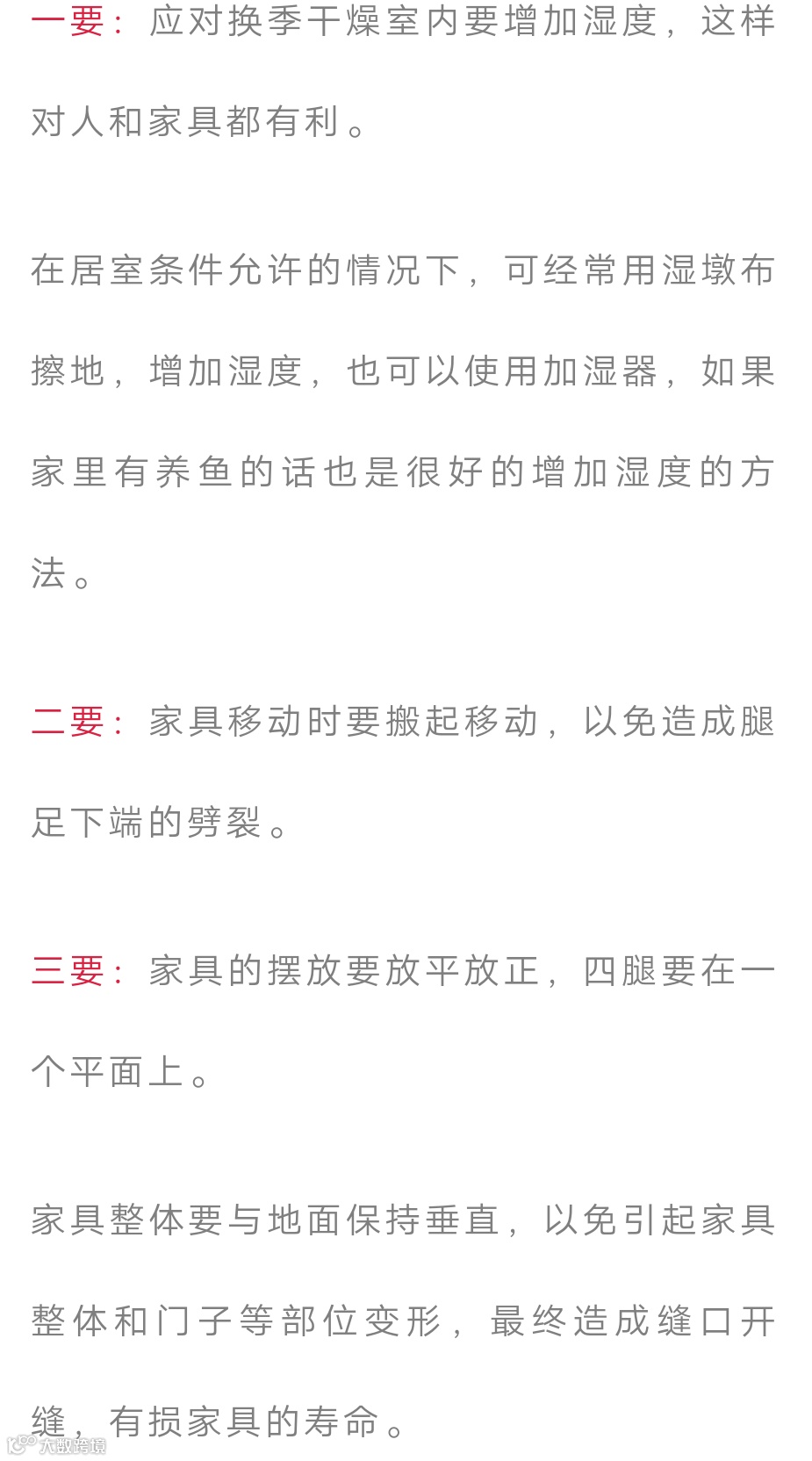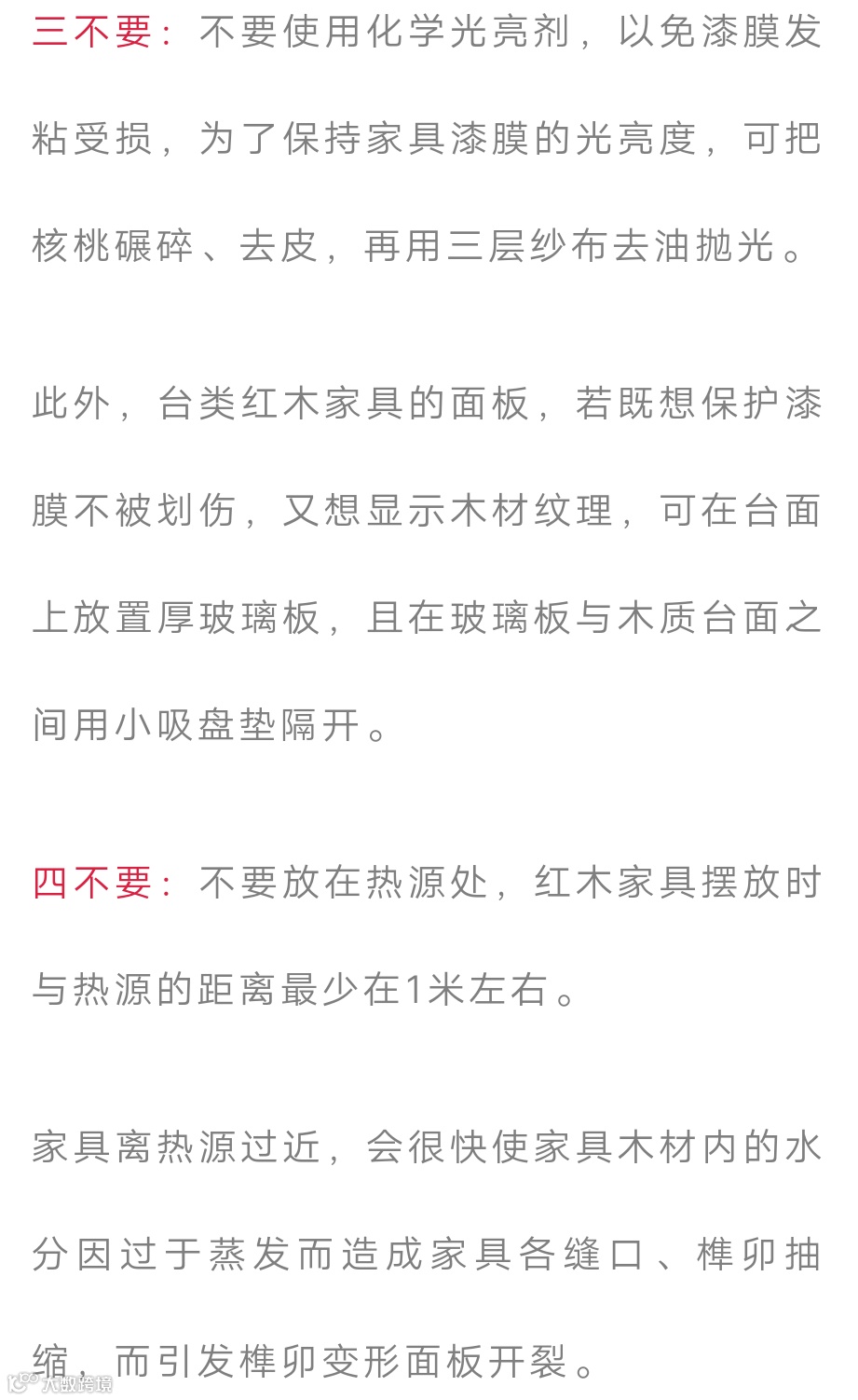 一不要:不要使用湿布去擦家具灰尘,应首先将家具浮面灰尘轻轻拂去,再用纯棉干布擦,以免颗粒灰尘伤害家具表层而不美观。